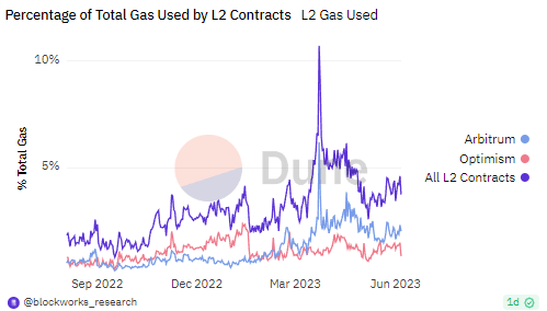 L2s have slowly but surely started to gain more usage across the past year. As Optimism and Arbitrum continue to gain adoption, various other L2s such as Polygon zkEVM, Scroll, and zkSync Era are just launching or growing. This leads to a future where much of the activity within the Ethereum ecosystem takes place on rollups.
